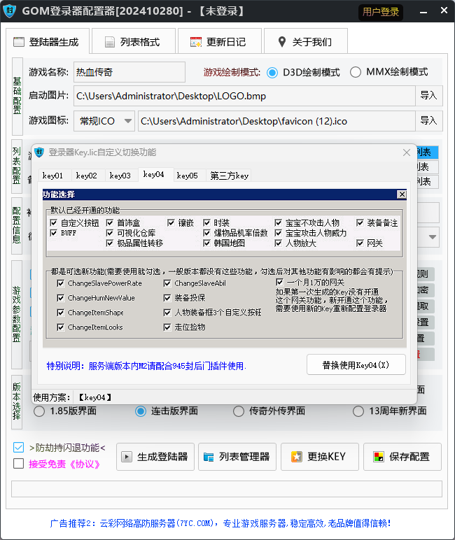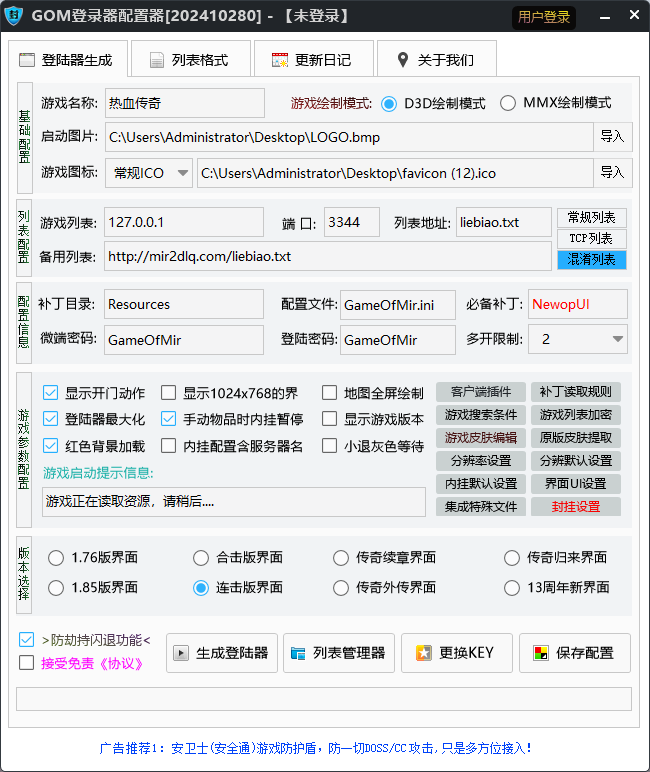 游戏说明:此登录器配置器,适合老GOM20151108版引擎,让我们一起低调的游戏,市场上该有的功能我们登录器都有,绿色无毒,安全稳定。。。 ***** 新游戏交流群②:377481944 (未满) 程序版本:2026-01-15-0(兼容同行引擎所有插件) 配置器地址: 全套引擎包: